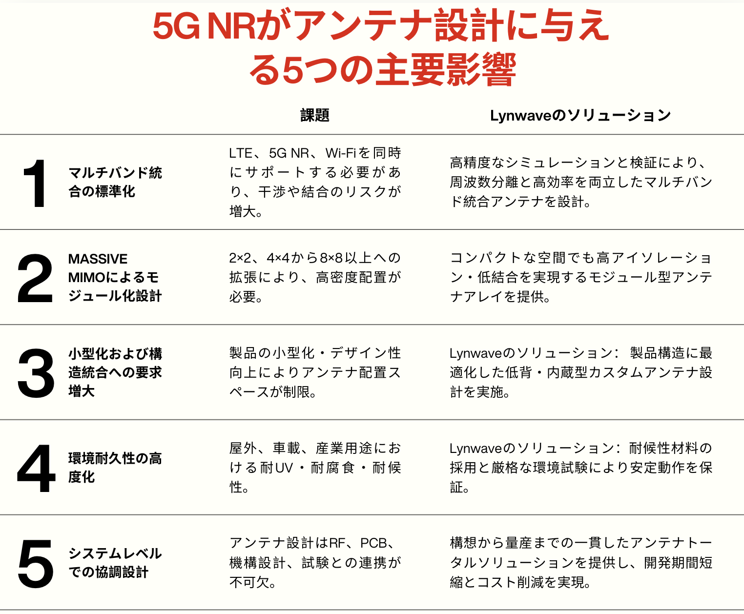 5G NRの進化により、アンテナ設計にはマルチバンド対応、高性能・省スペース設計、環境適応性、システム統合力が強く求められています。